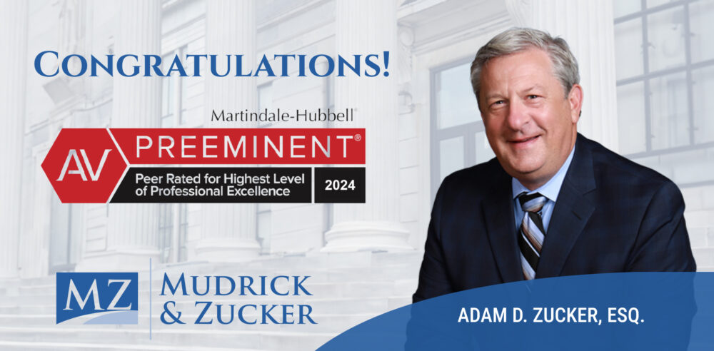 We are honored to announce that Adam D. Zucker, Esq. has recently been awarded an AV rating from Martindale-Hubbell, Judicial Edition. Notably, this AV rating accounts for the evaluations of judges and fellow lawyers in the legal community. It further signifies that Attorney Zucker’s peers rank him at the highest level of professional excellence for his legal knowledge, communication skills, and ethical standards. Congratulations!